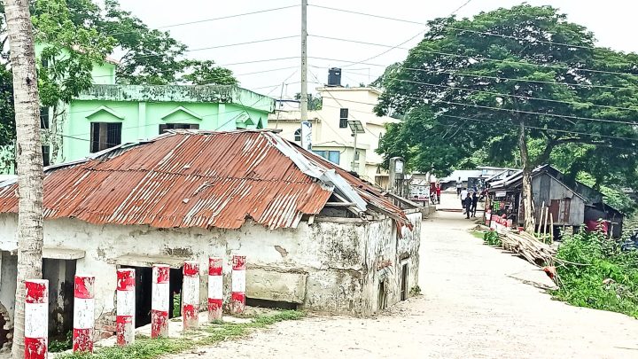 সড়কের মধ্যেই পরিত্যাক্ত ভবন যান চলাচলে বিঘ্ন ঘটছে