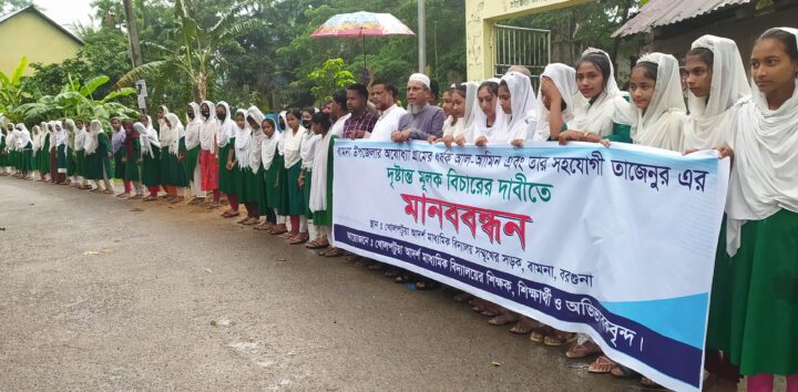 বামনায় ফাঁদে ফেলে স্কুল শিক্ষার্থীকে ধর্ষন ও ভিডিও ধারণ: শাস্তির দাবীতে সহপাঠীদের মানববন্ধন