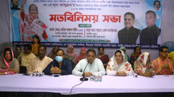 জাতীয় নির্বাচন সামনে রেখে বরিশাল-০৫ (সদর) আসনের নৌকা প্রতীকের প্রার্থীর পক্ষে ঐক্যবদ্ধ ভাবে কাজ করার লক্ষ্যে বরিশাল সিটি কর্পোরেশন এর নবনির্বাচিত মেয়র আবুল খায়ের আব্দুল্লাহ খোকন সেরনিয়াবাত এর সহধর্মিণী নারী নেত্রী লুনা আব্দুল্লাহ’র উদ্যোগে বাংলাদেশ মহিলা আওয়ামী লীগ বরিশাল মহানগর শাখার নেতৃবৃন্দদের সাথে মতবিনিময় সভার প্রথমদিনে স্থানীয় সংসদ সদস্য ও পানিসম্পদ প্রতিমন্ত্রী কর্নেল(অবঃ) জাহিদ ফারুক শামীম এমপি ও নবনির্বাচিত বিসিসি’র মেয়র আবুল খায়ের আব্দুল্লাহ খোকন সেরনিয়াবাত সম্মানিত অতিথি হিসেবে উপস্থিত ছিলেন।