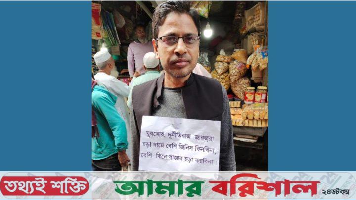 নিজস্ব প্রতিবেদক, বরিশাল: দ্রব্যমূল্যের ঊর্ধ্বগতি, ঘুষখোর ও দুর্নীতিবাজদের বিরুদ্ধে প্রতিবাদ জানিয়ে পোস্টার গায়ে লাগিয়ে বাজারে বাজারে ঘুরছেন পটুয়াখালী রূপালী ব্যাংকের প্রিন্সিপাল অফিসার গোলাম কবির ফরাজী। সরজমিনে গিয়ে দেখা যায় যে, পটুয়াখালী নিউমার্কেটের বাজারের বিভিন্ন জায়গায় হাতে বাজারের ব্যাগ আর বুকে পোস্টার লাগিয়ে দ্রব্যমূল্যের ঊর্ধ্বগতি, ঘুষখোর ও দুর্নীতিবাজদের বিরুদ্ধে প্রতিবাদ জানিয়ে ক্রেতা ও বিক্রেতাদের সচেতন করছেন গোলাম কবির ফরাজী।
