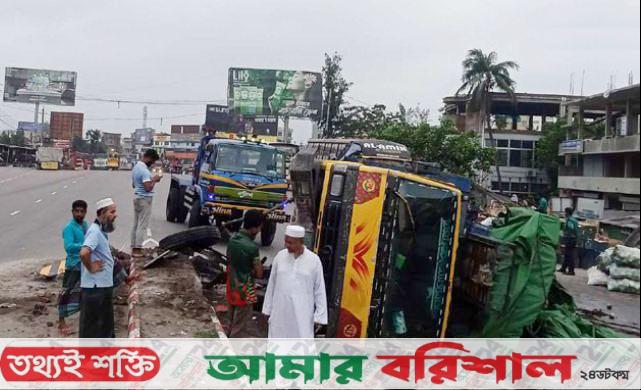 বরিশালে ডিভাইডারে ধাক্কা দিয়ে উল্টে গেল সবজিবোঝাই ট্রাক