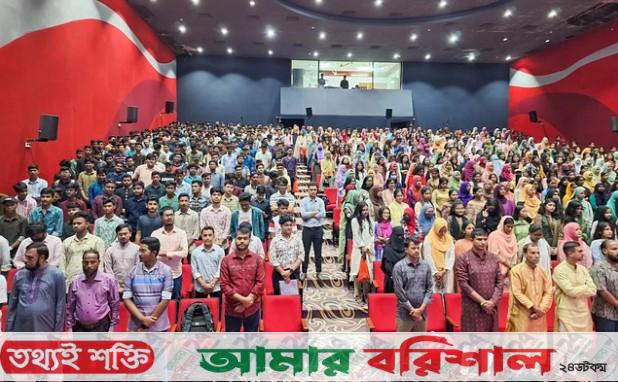 নগরের কীর্তনখোলা নদীতীরের বান্দরোডে শিল্পকলা একাডেমি মিলনায়তনে সকাল ১০টায় ডিজিটাল স্ক্রিনে জাতীয় পতাকা পতপত করে উড়ছিল এবং সঙ্গে বেজে ওঠে, ‘আমার সোনার বাংলা, আমি তোমায় ভালোবাসি…।’ এ সময় মিলনায়তনে পিনপতন নীরবতা।