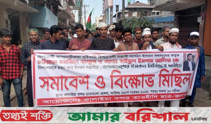 শুক্রবার (২৯ নভেম্বর) সকাল সারে ১০ টার দিকে কালাইয়া বন্দর তাওহিদী ছাত্র জনতার ব্যানারে বিক্ষোভ মিছিলটি অনুষ্ঠিত হয়। দেশদ্রোহী সম্পদায়ীকতা সৃষ্টিকারী হিন্দুত্ববাদী সন্ত্রসী সংগঠন ইসকন সদস্যরা চট্টগ্রামে ১টি মসজিদে হামলা ও ভাংচুর এবং এডভোকেট মোঃ সাইফুল ইসলাম আলিফকে প্রকাশ্যে নিশংসভাবে হত্যা করে এই ইসকন সন্ত্রাসীরা।