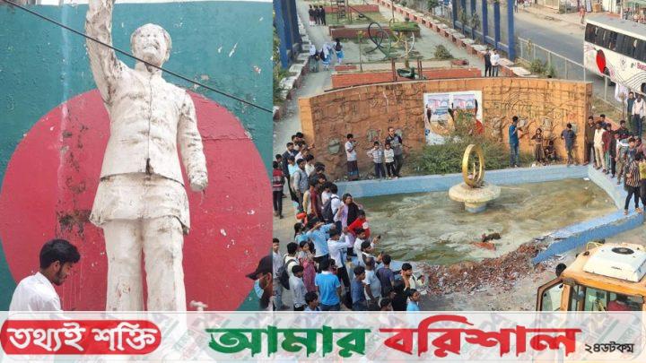 বরিশালে ভাঙা হলো শেখ মুজিবের ভাস্কর্য ও সাদিকের মায়ের নামে করা পার্ক