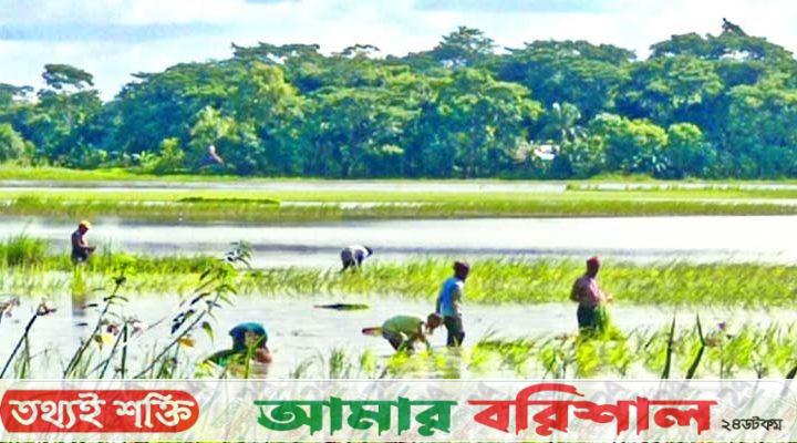 বাউফলে জমিতে আমন রোপণে ব্যস্ত কৃষক