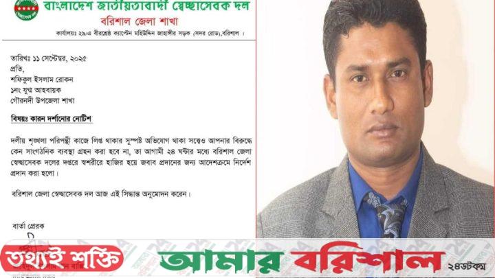শুক্রবার দুপুরে জেলা শাখার দপ্তর থেকে প্রেরিত নোটিশ সূত্রে জানা গেছে, তাকে (রোকন) আগামী ২৪ ঘণ্টার মধ্যে লিখিতভাবে জবাব দেয়ার পাশাপাশি স্ব-শরীরে উপস্থিত হওয়ার নির্দেশ দেয়া হয়েছে। জেলা স্বেচ্ছাসেবক দলের দায়িত্বপ্রাপ্ত দপ্তর সম্পাদক জাহিদুল ইসলাম খান বাপ্পির স্বাক্ষরিত ১১ সেপ্টেম্বরের ওই নোটিশে বলা হয়েছে, রোকনের বিরুদ্ধে দলীয় শৃঙ্খলা পরিপন্থী কর্মকান্ডে জড়িত থাকার সুস্পষ্ট অভিযোগ রয়েছে। অভিযোগের বিষয়ে সন্তোষজনক জবাব না পাওয়া গেলে তার বিরুদ্ধে শাস্তিমূলক ব্যবস্থা গ্রহণ করা হবে।