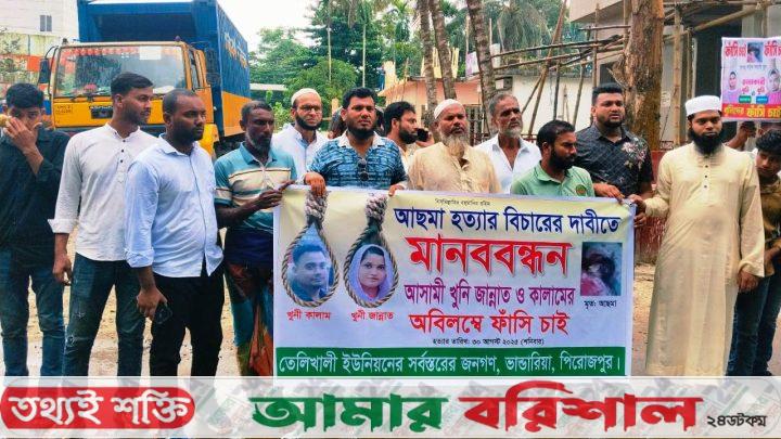পিরোজপুর প্রতিনিধি: পিরোজপুরের ভাণ্ডারিয়ায় পুত্রবধূর হাতে আসমা আক্তার (৪৫) নামের এক নারী হত্যার ঘটনায় জড়িতদের গ্রেপ্তার ও দৃষ্টান্তমূলক শাস্তির দাবিতে মানববন্ধন অনুষ্ঠিত হয়েছে। সোমবার (১৫ সেপ্টেম্বর) সকালে জেলা আদালত চত্বরে স্থানীয় শতাধিক মানুষ এ কর্মসূচিতে অংশ নেন।