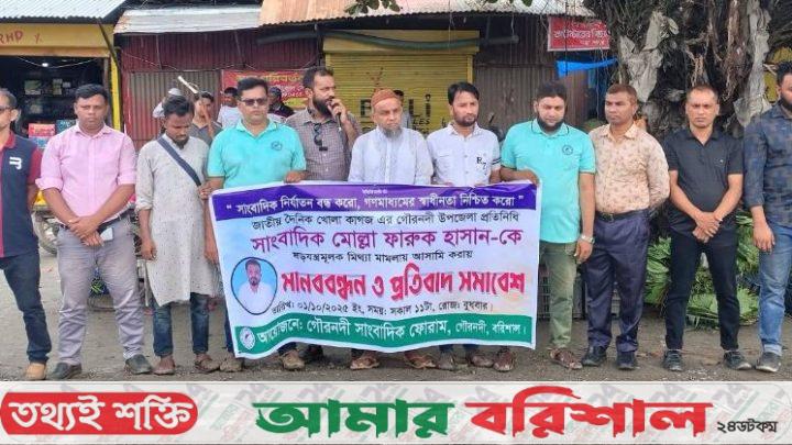 গৌরনদীতে সাংবাদিক মোল্লা ফারুকের বিরুদ্ধে মিথ্যা মামলা প্রত্যাহারের দাবিতে মানববন্ধন