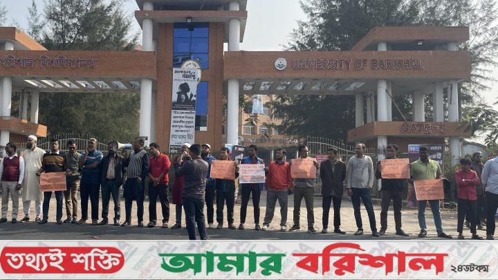 নবম পে স্কেলের দাবিতে বরিশাল বিশ্ববিদ্যালয়ে কর্মকর্তা–কর্মচারীদের মানববন্ধন ও বিক্ষোভ
