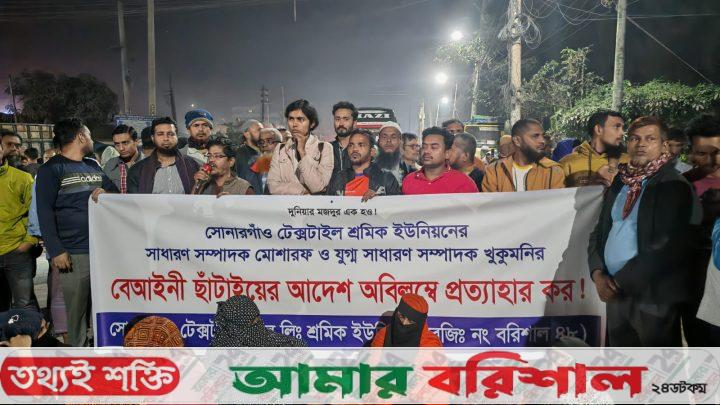 ট্রেড ইউনিয়ন করায় সোনারগাঁও টেক্সটাইলের দুই শ্রমিক নেতাকে ছাটাই করার প্রতিবাদে বরিশাল-কুয়াকাটা মহাসড়ক অবরোধ করেছে আন্দোলনরত শ্রমিকরা।