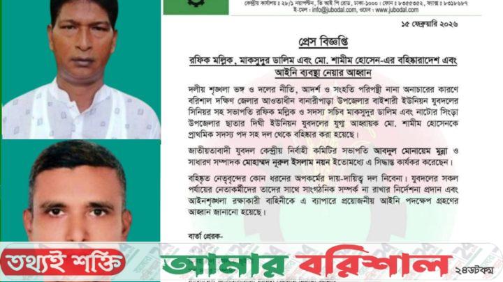 প্রেসবিজ্ঞপ্তিতে জানা গেছে, বরিশাল দক্ষিণ জেলার আওতাধীন বানারীপাড়া উপজেলার বাইশারী ইউনিয়ন যুবদলের সিনিয়র সহ-সভাপতি রফিক মল্লিক ও সদস্য সচিব মাকসুদুর ডালিমের প্রাথমিক সদস্য পদসহ দল থেকে তাদের দুইজনকে বহিষ্কার করা হয়েছে।