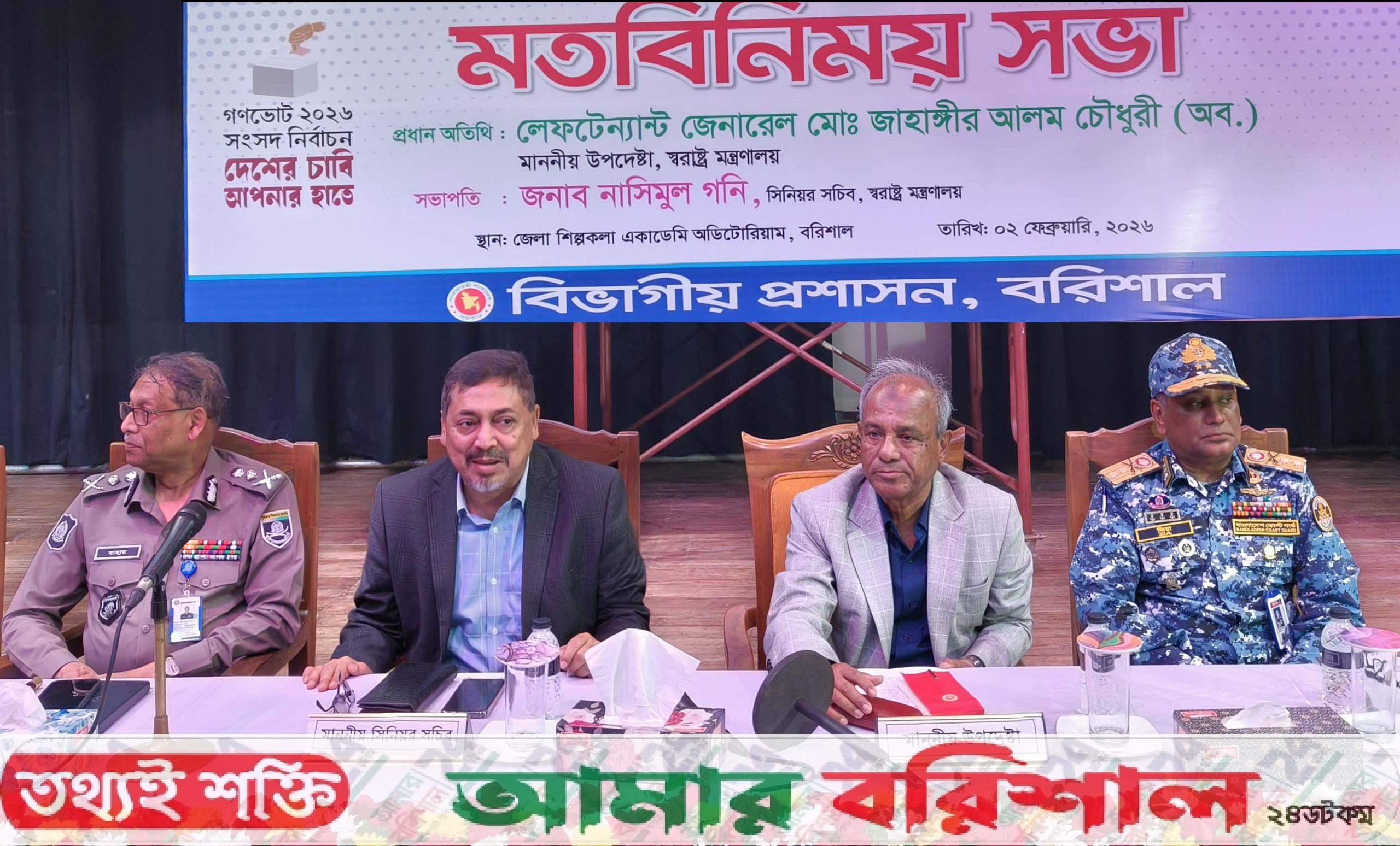 সোমবার (২ফেবুয়ারী) দুপুরে বরিশাল শিল্পকলা একাডেমি মিলনায়তনে সংসদ নির্বাচনও গণভোট সুষ্ঠুভাবে সম্পাদনের লক্ষ্যে বিভাগের প্রতিটি জেলা-উপজেলার কর্মকর্তাদের সাথেআইনশৃঙ্খলা বিষয়ক মতবিনিময় সভায় প্রধান অতিথির বক্ত্যেবে তিনি একথা বলেন।